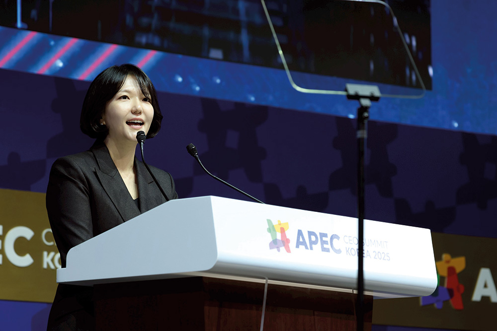 CEO Soo-yeon Choi delivering a keynote speech at the 2025 APEC CEO Summit